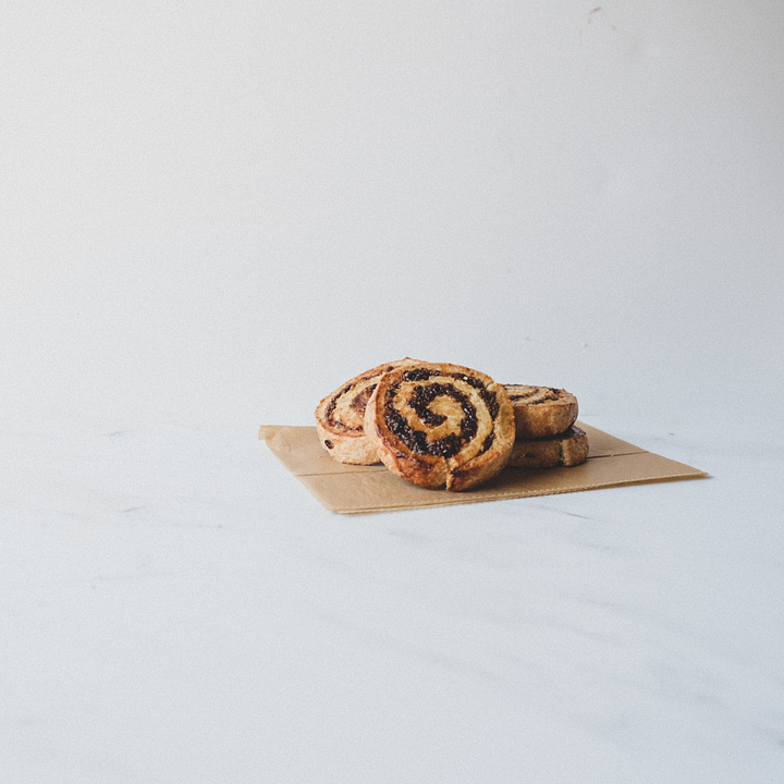 Pinwheel - cream cheese dough, apricot jam, cinnamon raisin & walnut fill.
